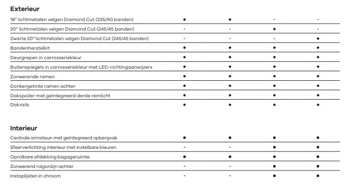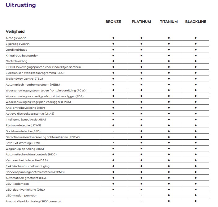 Op hogere uitrustingen komen daar BSD (dodehoekdetectie), RCTW (kruisend verkeer achter) en Safe Exit Warning bij. Trailer Sway Control, Multi Collision Brake en optioneel een 360° camera zorgen voor extra vertrouwen in elke situatie.