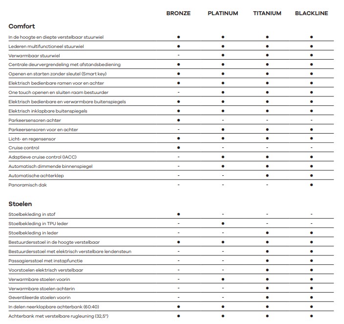 - 5 jaar of 100.000 km fabrieksgarantie, wat het eerst bereikt wordt