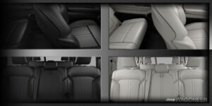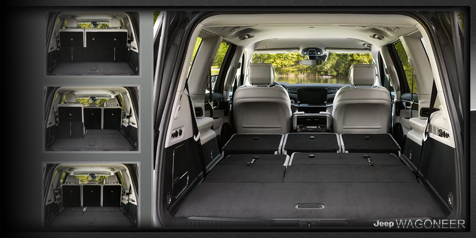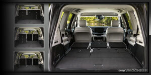 Configureer uw cabine – Beschikbare elektrisch neerklapbare zitbank op de derde rij. Regel met één druk op de knop flexibele zit- en opbergmogelijkheden. Volledig neergelaten ligt de bank op de derde rij volledig plat in de laadvloer en biedt hij een naadloze ruimte. Het meeste vrachtvolume in zijn klasse achter de derde rij. Met het meeste vrachtvolume in zijn klasse achter de derde rij, de Wagoneer is uitgerust met ongelooflijk veel ruimte achter de zitbank op de derde rij. Nu kunt u meer bagage, uitrusting en speelgoed meenemen naar uw bestemming.