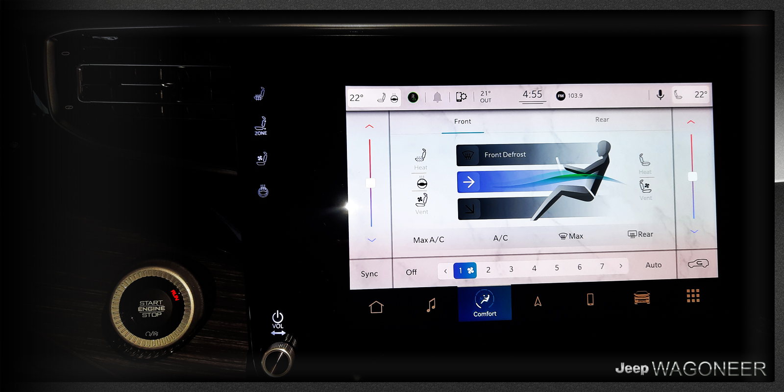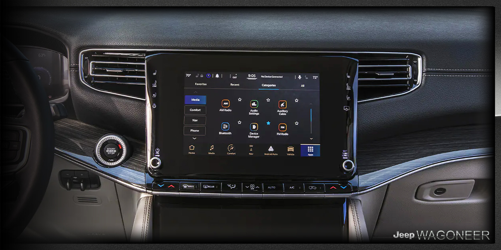 - Touchscreen-technologie voor een verbeterde ervaring – Verbeterd kijkcomfort tijdens uw reis is van u dankzij het herconfigureerbare 30-cm (12-inch) touchscreen dat standaard wordt geleverd op de geheel nieuwe Grand Wagoneer. Gebruik het volledig aanpasbare startscherm voor bediening met één druk op de knop voor een groot aantal toepassingen, of kies voor gesplitste schermfunctionaliteit. Superieure reactiesnelheid op touchscreen-invoer zorgt voor een nieuw niveau van bedieningsgemak voor uw touchscreen-ervaring dankzij een geheel nieuw Android-besturingssysteem dat vijf keer sneller is dan de vorige generatie en tot 64 GB flash-geheugen bevat.