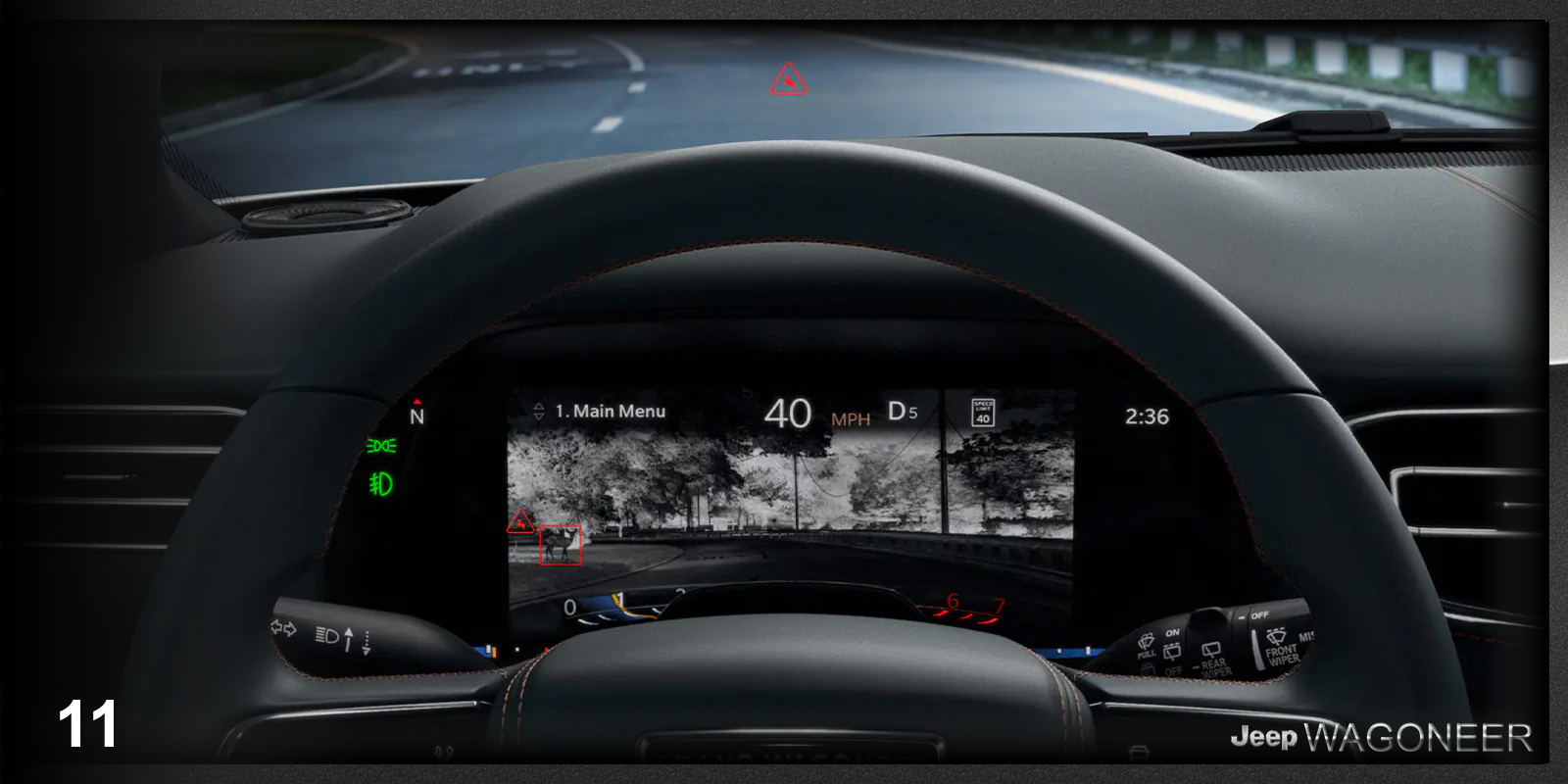 - 11 – Diepte van waarneming – Nachtzichtcamera met voetganger- en dierdetectie. De beschikbare Nachtzichtcamera met Voetganger- en Dierdetectie maakt gebruik van thermische beeldvorming om objecten, dieren en voetgangers in het donker te detecteren. Onverwachte obstakels worden dan geprojecteerd op het Driver Information Digital Cluster Display.