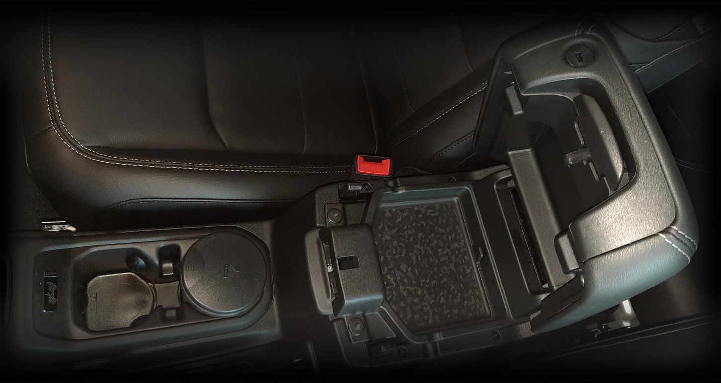 Aan boord van de Jeep® Wrangler 4xe Plug-in Hybrid kunnen kleine waardevolle spullen worden opgeborgen in het handschoenenkastje en de vakken in de afsluitbare middenconsole – een veilige plek, zelfs tijdens het rijden in de openlucht.