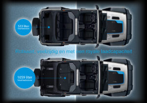 • Automatisch geregelde Dual Zone Airconditioning • LED ambient interieurverlichting • Stuurwiel met leder bekleed • Voorstoelen stof met “Sahara” logo.
