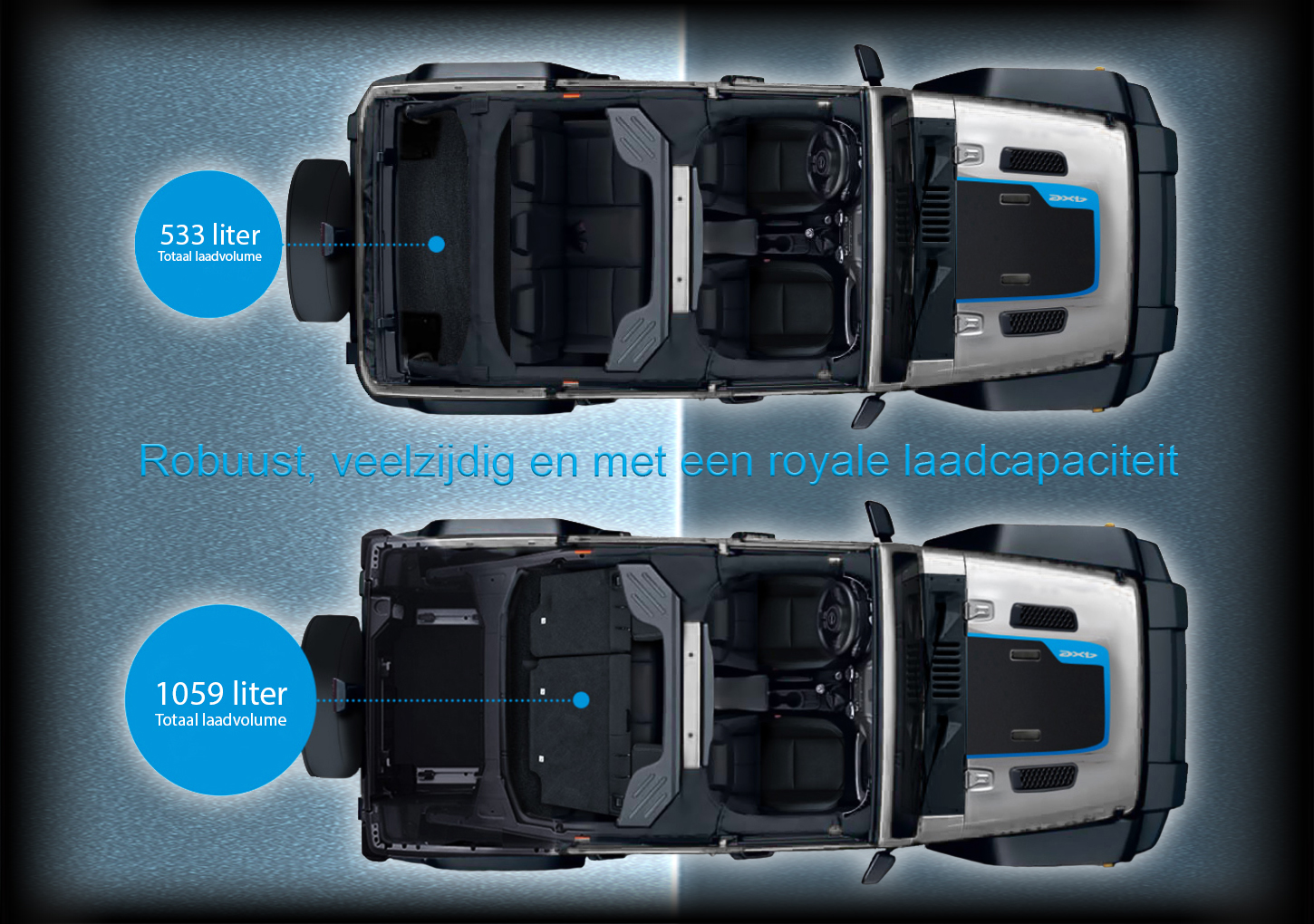 • Grille in carrosseriekleur, 7 sleuven met donkere accenten • Verwijderbare portieren voor en achter en omklapbare voorruit • Volwaardig reservewiel op de achterklep • Sleephaak achter • Voorbumper met donkergrijze accenten • Sticker 4xe op motorkap • Bodembescherming voor transmissie, brandstoftank en tussenbak • Logo’s met blauwe accenten • 4xe logo op achterklep • LED verlichting voor en achter, inclusief mistlampen vóór • Premium Sunrider soft top • Spatborden in zwart • 17” lichtmetalen velgen.