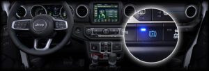 Het Jeep® Wrangler 4xe Plug-in Hybrid-instrumentenpaneel heeft een nieuw 7″ TFT-display, aanpasbaar op meer dan 100 verschillende manieren om gemakkelijk en intuïtief informatie af te lezen over snelheid, resterende actieradius, bandenspanning en meer.