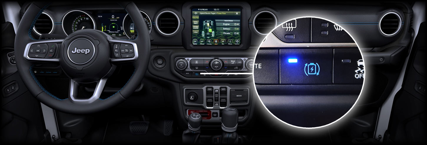 Links van het stuur van de nieuwe Jeep® Wrangler 4xe Plug-in Hybrid kunt u met het Hybrid Mode Selector-systeem de rijstijl kiezen die het beste bij uw behoeften past.