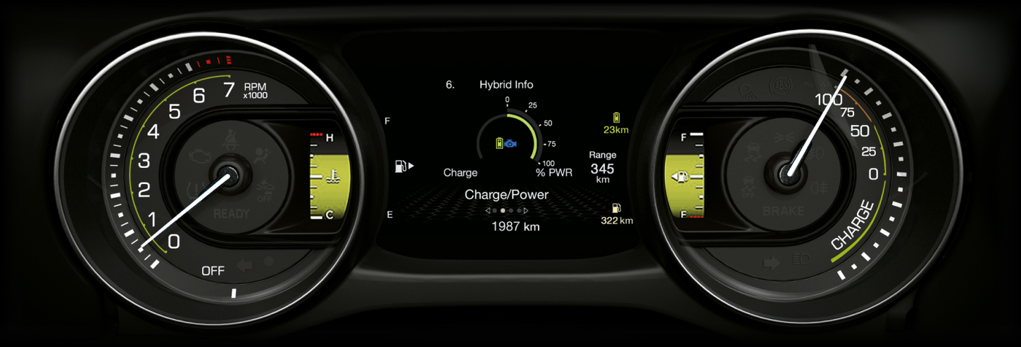 De nieuwe Wrangler 4xe Plug-in Hybrid technologie introduceert alle nieuwe 4xe-functies, zoals de Uconnect™ Infotainment Hybrid Pages, de nieuwe rijparameters in het TFT-instrumentenpaneel en de speciale Uconnect™ Services.