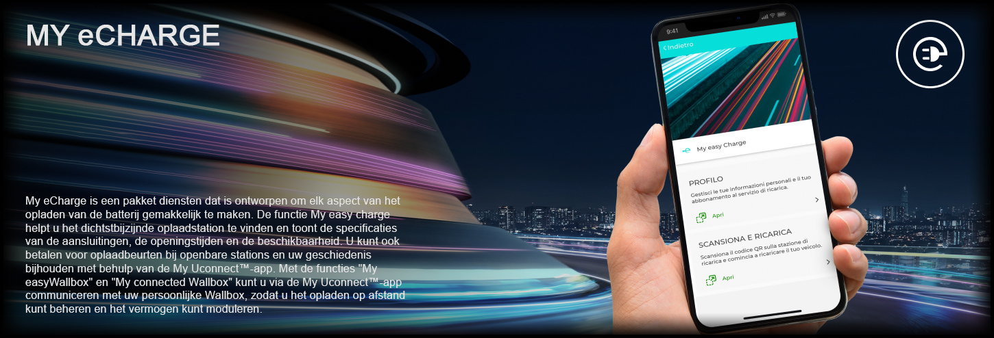 My eCharge is een pakket diensten dat is ontworpen om elk aspect van het opladen van de batterij gemakkelijk te maken. De functie My easy charge helpt u het dichtstbijzijnde oplaadstation te vinden en toont de specificaties van de aansluitingen, de openingstijden en de beschikbaarheid. U kunt ook betalen voor oplaadbeurten bij openbare stations en uw geschiedenis bijhouden met behulp van de My Uconnect™-app. Met de functies “My easyWallbox” en “My connected Wallbox” kunt u via de My Uconnect™-app communiceren met uw persoonlijke Wallbox, zodat u het opladen op afstand kunt beheren en het vermogen kunt moduleren.
