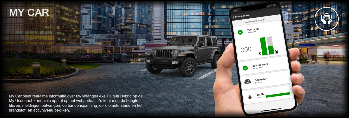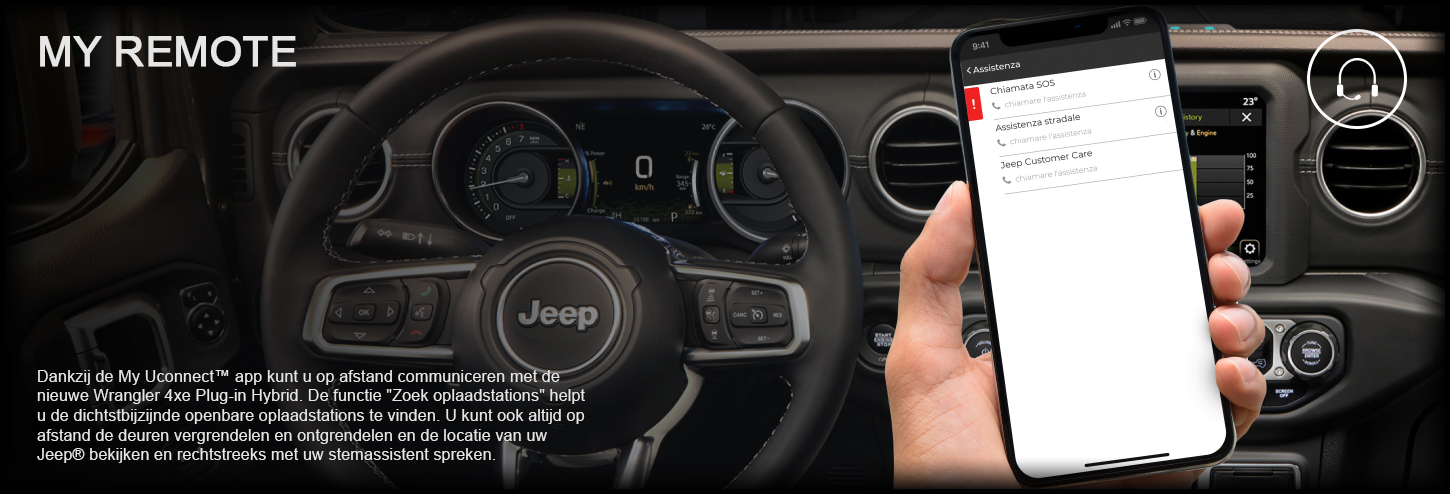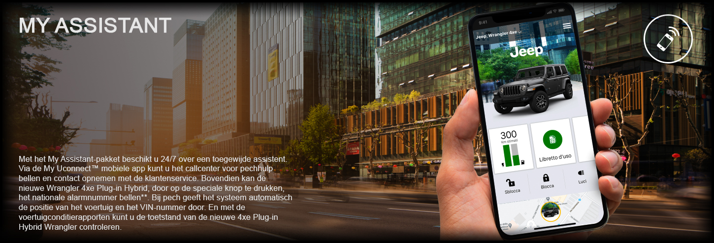 Met het My Assistant-pakket beschikt u 24/7 over een toegewijde assistent. Via de My Uconnect™ mobiele app kunt u het callcenter voor pechhulp bellen en contact opnemen met de klantenservice. Bovendien kan de nieuwe Wrangler 4xe Plug-in Hybrid, door op de speciale knop te drukken, het nationale alarmnummer bellen**. Bij pech geeft het systeem automatisch de positie van het voertuig en het VIN-nummer door. En met de voertuigconditierapporten kunt u de toetstand van de nieuwe 4xe Plug-in Hybrid Wrangler controleren. **noodoproepen kunnen niet worden gedaan vanaf het touchscreen van het voertuig of de My Uconnect™-app