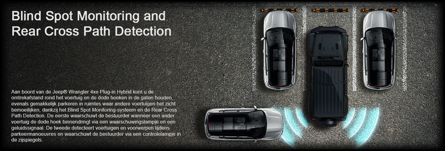 Aan boord van de Jeep® Wrangler 4xe Plug-in Hybrid kunt u de omtrekafstand rond het voertuig en de dode hoeken in de gaten houden, evenals gemakkelijk parkeren in ruimtes waar andere voertuigen het zicht bemoeilijken, dankzij het Blind Spot Monitoring-systeem en de Rear Cross Path Detection. De eerste waarschuwt de bestuurder wanneer een ander voertuig de dode hoek binnendringt via een waarschuwingslampje en een geluidssignaal. De tweede detecteert voertuigen en voorwerpen tijdens parkeermanoeuvres en waarschuwt de bestuurder via een controlelampje in de zijspiegels.