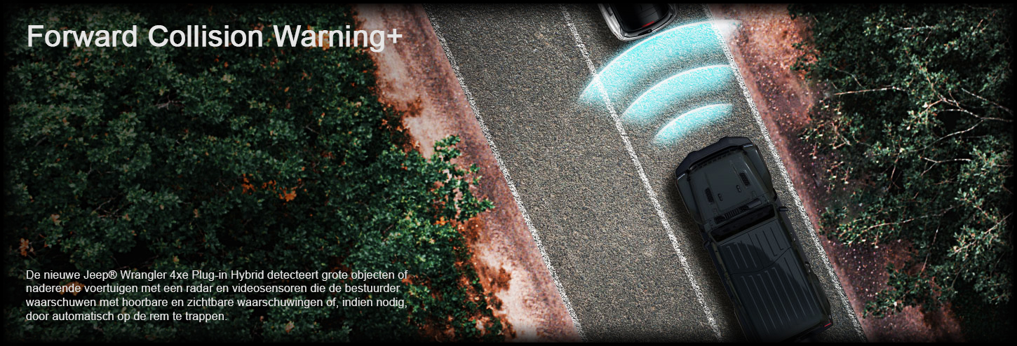 De nieuwe Jeep® Wrangler 4xe Plug-in Hybrid detecteert grote objecten of naderende voertuigen met een radar en videosensoren die de bestuurder waarschuwen met hoorbare en zichtbare waarschuwingen of, indien nodig, door automatisch op de rem te trappen.