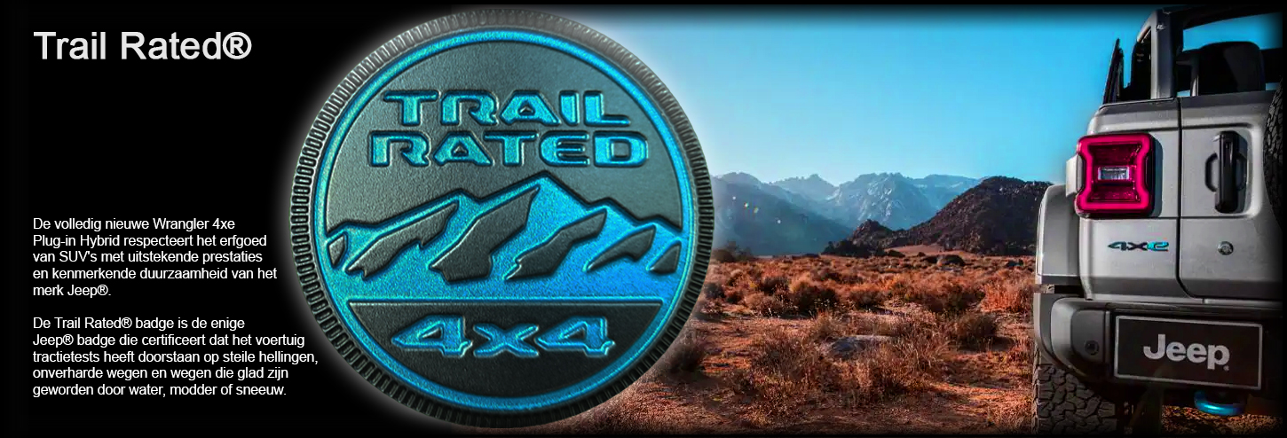 De volledig nieuwe Wrangler 4xe Plug-in Hybrid respecteert het erfgoed van SUV’s met uitstekende prestaties en kenmerkende duurzaamheid van het merk Jeep®. De Trail Rated® badge is de enige Jeep® badge die certificeert dat het voertuig tractietests heeft doorstaan op steile hellingen, onverharde wegen en wegen die glad zijn geworden door water, modder of sneeuw.