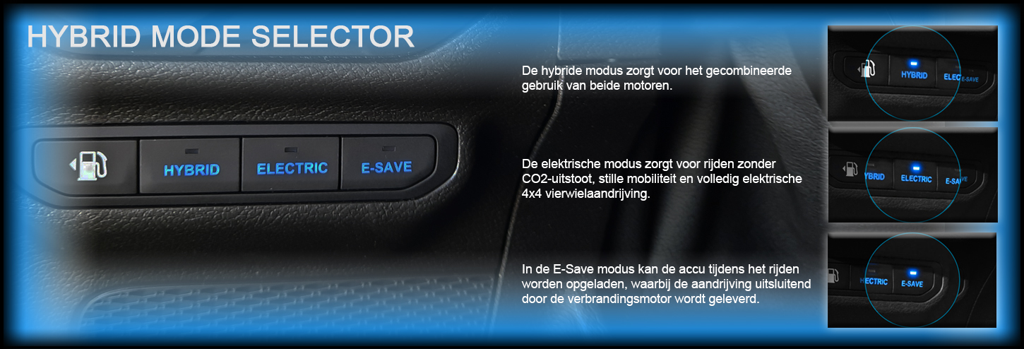 De elektrische modus zorgt voor rijden zonder CO2-uitstoot, stille mobiliteit en volledig elektrische 4×4 vierwielaandrijving. - E-Save modus