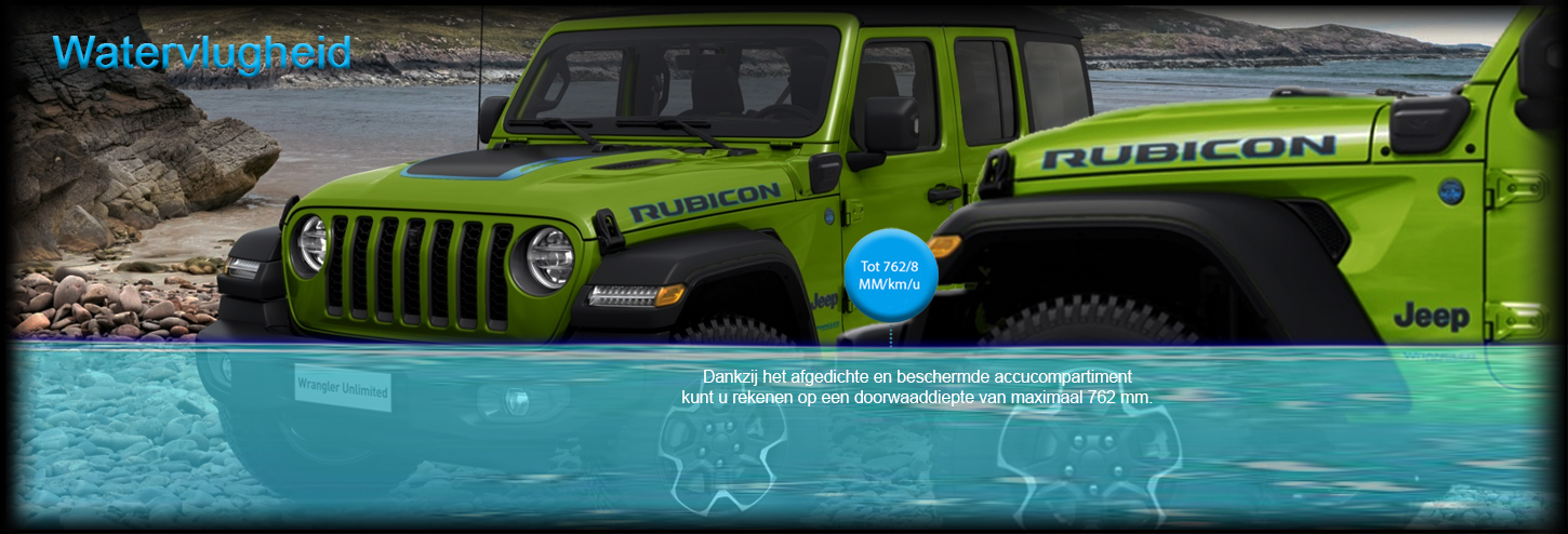 De nieuwe Jeep® Wrangler 4xe Plug-in Hybrid is zelfs in staat om off-road waterwegen over te steken. Dankzij het afgedichte en beschermde accucompartiment kunt u rekenen op een doorwaaddiepte van maximaal 762 mm.